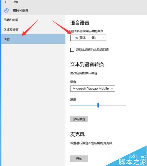 2、在语言的设置页面点击左侧的“语音”,然后再右侧会显示“选择你与设备所讲的语音”,请确保是“中文(简体,中国)”,下面还有麦克风的设置,你可以点击设置一下,确保麦克风没有问题