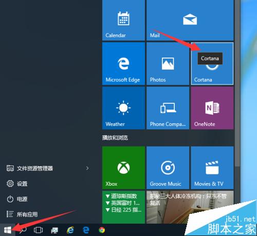 3、然后点击“开始”按钮,选择点击应用“Cortana”也就是小娜