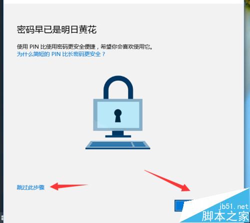 9、这里设置PIN密码的作用就是下次用Win10的时候,就要输入这个PIN密码才能进入桌面。但是你也可以不理,点击“跳过此步骤”即可,此时小娜Cortana的基本设置就完成了