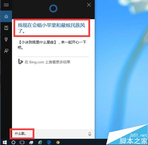 15、比如,小娜Cortana说她最近在学唱歌,我问:什么歌。她回答:"我现在会唱小苹果和最炫名族风了。"