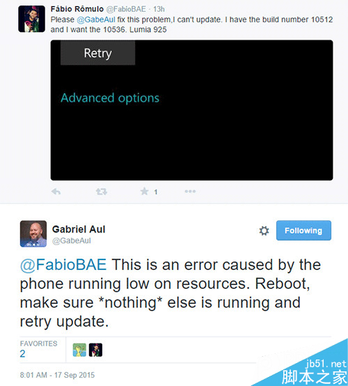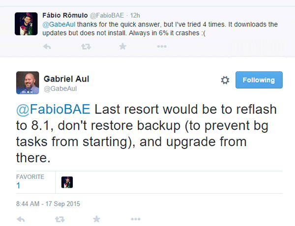 不过该网友在尝试4次之后表示,虽然可以下载系统更新,但是又显示无法安装,总是在进度6%时出现崩溃现象。Gabriel Aul最终建议刷回WP8.1系统,不要选择恢复备份(防止bg任务启动),然后再进行升级。