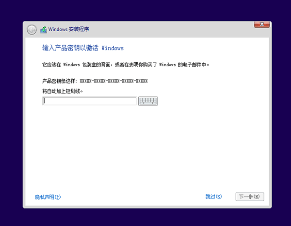 “如果这是你首次在这台电脑中安装Win10(或者你正在尝试安装一个不同的版本),你需要输入一个Win10产品密钥。如果你购买的是数字版,那么产品密钥应该在你的邮件中;如果是盒装版,产品密钥应该在盒子中的一个标签中。“