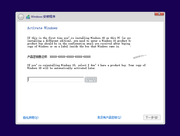 “如果你是重装Win10,请选择‘我没有产品密钥’。Win10安装完成后会自动激活(注:要联网)。”