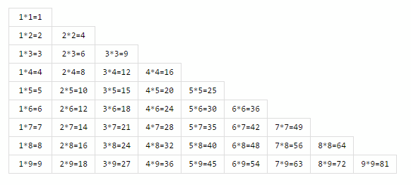 #result{ width:550px; margin:30px auto; font-size:0; font-family:Consolas,"Liberation Mono",Menlo,Courier,monospace;}#result span{ display:inline-block; width:60px; height:25px; line-height:25px; font-size:12px; text-align:center; border:1px solid #eee; margin: -1px 0 0 -1px;}CSS代码也很简单,span中的margin主要就是为了消除出现双border的问题。function create(){ var html = []; for(var i = 1;i <= 9;i++){for(var j = 1;j <= i;j++){html.push("<span>"+j+"*"+i+"="+(j*i)+"</span>");} html.push("<br/>"); } return html;}1,新建一个用来放html代码片段的空数组:var html = [];2,使用for循环遍历出9*9乘法表格: