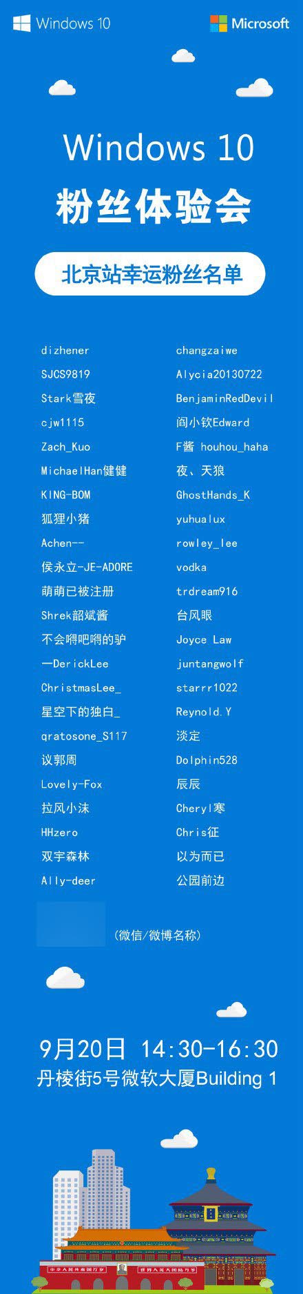 本次活动共有46名粉丝获得参观微软大厦资格,这些粉丝将于北京时间9月20日下午14:30至16:30在北京丹棱街5号微软大厦Building 1与微软共同交流Win10心得。没能获得该活动资格的朋友也不用灰心,目前广州站的招募正在进行中,更多机会向你招手。