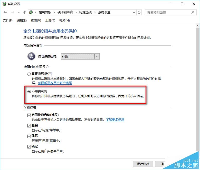7、勾选下方的不需要密码,点击保存修改按钮,如下图所示: