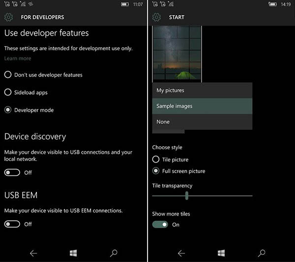 Win10 Mobile预览版10536.1004更新内容(非官方公布):• 面向开发人员设置中增加了USB EEM开关(目前这项功能貌似还不可用);