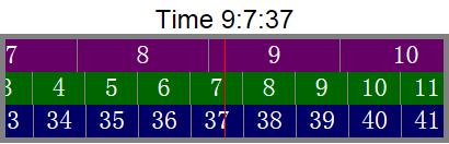 <!DOCTYPE html><html> <head><title>js流动时间</title><style type="text/css"> #divH, #divM, #divS {font-family: consal;line-height: 30px;position: absolute;left: 0px;width: 5760px;color: white; } #divH {background-color: #606; } #divM {background-color: #060; } #divS {background-color: #006; } #divH div, #divM div, #divS div {float: left;border-right: solid 1px gray;text-align: center; }</style> </head> <body><div style="font-family:Arial; width:400px; font-size:24px;"> <div id="divTime" style="text-align:center; line-height:1.5;">Time</div> <div style="outline:solid 5px gray; position:relative; overflow:hidden; height:90px;"><div id="divH" style="top:0px;"></div><div id="divM" style="top:30px;"></div><div id="divS" style="top:60px;"></div><div id="divLine" style="position:absolute; top:0px; left:50%; border-left:solid 1px red; height:90px;"></div> </div></div><script type="text/javascript"> var divH = document.getElementById("divH"); var divM = document.getElementById("divM"); var divS = document.getElementById("divS"); var divTime = document.getElementById("divTime"); var aw = 2880; var ww = 400; var w = aw / 24; for (var i = 0; i < 48; i++) {var div = document.createElement("div");div.style.width = (w - 1) + "px";div.innerHTML = i % 24;divH.appendChild(div); } w = aw / 60; for (var i = 0; i < 120; i++) {var div = document.createElement("div");div.style.width = (w - 1) + "px";div.innerHTML = i % 60;divM.appendChild(div); } w = aw / 60; for (var i = 0; i < 120; i++) {var div = document.createElement("div");div.style.width = (w - 1) + "px";div.innerHTML = i % 60;divS.appendChild(div); } window.setInterval(run, 20); function run() {var dt = new Date();var h = dt.getHours();var m = dt.getMinutes();var s = dt.getSeconds();var f = dt.getMilliseconds();divH.style.left = ((h > 12) ? 0 : -aw) + ww / 2 + (h * -120) - m * 2 + "px";l = 0;divM.style.left = ((m > 30) ? 0 : -aw) + ww / 2 + (m * -48) - s / 1.2 + "px";l = 0;divS.style.left = ((s > 30) ? 0 : -aw) + ww / 2 + (s * -48) - f * 48 / 1000 + "px";divTime.innerHTML = "Time " + h + ":" + m + ":" + s; }</script> </body></html>以上就是本文的全部内容,希望对大家学习javascript程序设计有所帮助。