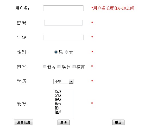 <form name="myform" action="javascript:alert("注册成功!");" method="post" onsubmit="return yanzheng();"><table width="500px"><tbody><tr><td>用户名:</td><td><input name="username" id="username" type="text" /></td><td align="left"><p style="color: #FF0000">*用户名长度在6-10之间</p></td></tr><tr><td>密 码:</td><td><input id="password" onchange="passwordleave()" type="password" /></td><td align="left"><p style="color: #FF0000">*<input id="Button1" type="button" value="弱" style="background-color: #FF0000" /><input id="Button2" type="button" value="中" style="background-color: #FF0000" /><input id="Button3" type="button" value="强" style="background-color: #FF0000" /><label id="lavel"></label></p></td></tr><tr><td>年 龄:</td><td><input id="age" type="text" /></td><td align="left"><p style="color: #FF0000">*</p></td></tr><tr><td>性 别:</td><td><input name="sex" type="radio" value="男" checked="checked" />男<input name="sex" type="radio" value="女"/>女</td><td align="left"><p style="color: #FF0000">*</p></td></tr><tr><td>内 容:</td><td><input type="checkbox" name="content" value="新闻" />新闻<input type="checkbox" name="content" value="娱乐" />娱乐<input type="checkbox" name="content" value="教育" />教育</td><td align="left"><p style="color: #FF0000">*</p></td></tr><tr><td>学 历:</td><td><select name="edu_level" style="width: 74px"><option value="1">小学</option><option value="2">中学</option><option value="3">大学</option><option value="4">大学以上</option></select></td><td align="left"><p style="color: #FF0000">*</p></td></tr><tr><td>爱 好:</td><td><select name="like" size="6" multiple="multiple" style="width: 72px; height: 108px"><option value="1">篮球</option><option value="2">足球</option><option value="3">排球</option><option value="4">跑步</option><option value="5">登山</option><option value="6">健美</option></select></td><td align="left"><p style="color: #FF0000">*</p></td></tr><tr><td><input id="Button4" type="button" onclick="checkinfo()" value="查看信息" /></td><td><input type="submit" name="tijiao" value="注册" /></td><td><input type="reset" name="reset" value="重置" /></td></tr></tbody></table></form>JS脚本: