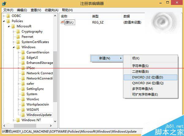 2、定位到:HKEY_LOCAL_MACHINESOFTWAREPoliciesMicrosoftWindowsWindowsUpdate