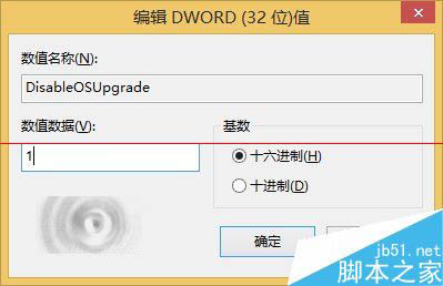 4、双击打开DisableOSUpgrade,将数值数据改为1,点击“确定”即可,如下图——