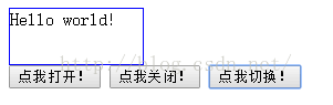 <html><head> <meta http-equiv="Content-Type" content="text/html; charset=utf-8" /><title>初识jQuery</title> <script src="http:/www.jb51.net/jquery/1.9.0/jquery.js" type="text/javascript"></script> <!--引用这个jquery库--><style> #test{ display:none; width:120px; height:50px; border:1px solid blue;} </style> </head><body> <div id="test">Hello world!</div> <!--设置三个按钮,每次点击调用特定的函数--> <button onclick="sayHello()">点我打开!</button> <button onclick="sayGoodbye()">点我关闭!</button> <button onclick="change()">点我切换!</button><script type="text/javascript"> function sayHello(){ $("#test").show(5000); <!--设参数5000,表示用5000ms的时间完成这个动作-->} function sayGoodbye(){ $("#test").hide(); <!--不设置,默认速度--> } function change(){ $("#test").toggle("slow"); <!--设置以slow的速度打开--> } </script> </body> </html> 效果图: