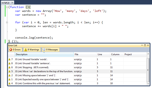 当你看到JSLint名称的时候,你可能感觉到不用JavaScript就没办法做前端开发。但是如何使用一些模式以及验证你的JS代码,JSLint可以为你做这件事。使用这个插件可能刚开始会让你感觉不爽,因为他使用了很多类似C#的规则(例如,某些变量声明了但是没使用)在编译的时候提示警告。但是一旦过了一段时间以后,你就会发现它确实帮你改掉了很多坏习惯,也让你的代码更加容易维护。