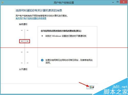6、用户账户控制设置中将这里的按钮拖动到上方你需要的地方,确定。然后重新启动电脑,看看再次打开图片的效果,是不是还出现提示。