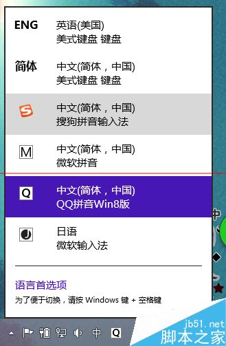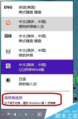 2、这时在任务栏上方会出现已经安装的输入法的列表,第一个为电脑默认输入法。鼠标左键点击“语言首选项”。