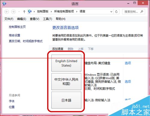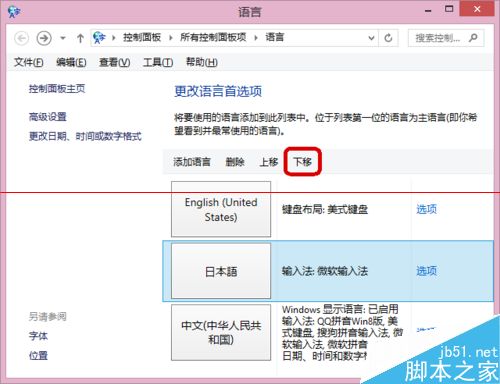 3、出现一个叫做“语言”的对话框,红框中圈出的就是电脑上安装的不同语言。左键点击选中“日本语”,这时列表上方的“上移”、“下移”等按钮变成黑色,“日本语”显示选中状态。左键点击“下移”,“日本语”就会从第二个变为第三个。