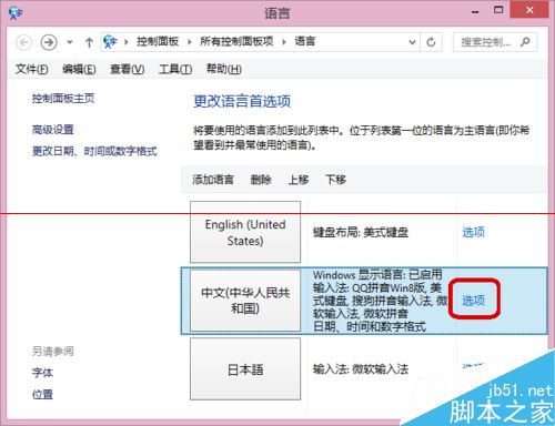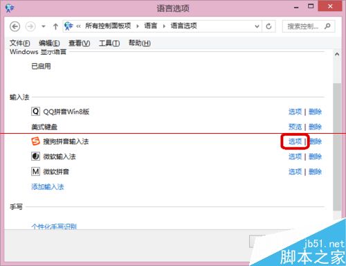 4、对于中文的不同输入法,我们利用搜狗输入法自带的功能来改变它们的顺序。依然在“语言”对话框中,左键点击“中文”后的“选项”按钮。