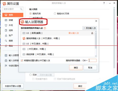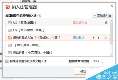 注意事项:第一个位置是默认输入法,这个要通过改变默认输入法来设置,虽然搜狗输入法的输入法管理器中显示了电脑上的所有输入法,但如果将日文输入法移动到两种中文输入法中间,它们的相对位置仍然不会改变。这是因为系统首先将不同的语言进行了分类排序,然后针对同种语言对输入法排序。