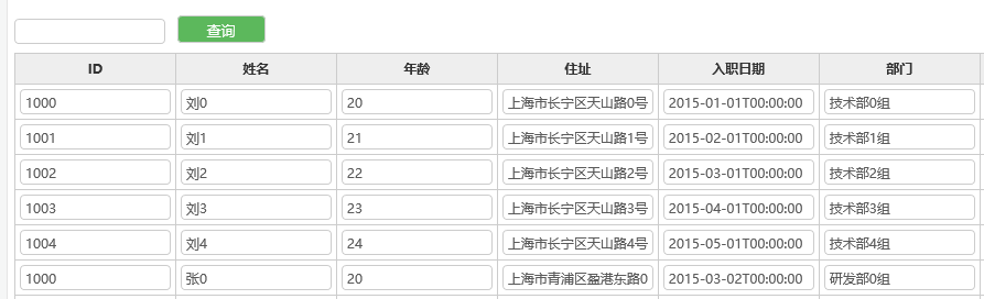 <div ms-controller="avalonCtrl"><div style="margin: 8px 0px;"><input type="text" class="form-control" ms-duplex="key" /> <input type="button" value="查询" ms-click="query" class="btn-box btn-submit-box" /></div><table class="data-table"><tr> <th>ID</th> <th>姓名</th> <th>年龄</th> <th>住址</th> <th>入职日期</th> <th>部门</th> <th>薪水</th></tr><tr ms-repeat-emp="emps"> <td>{{emp.ID}}</td> <td>{{emp.Name}}</td> <td>{{emp.Age}}</td> <td>{{emp.Address}}</td> <td>{{emp.JoinDate}}</td> <td>{{emp.Department}}</td> <td>{{emp.Salary}}</td></tr></table> </div> var vm = avalon.define({$id: "avalonCtrl",emps: [],key: "",query: function () {$.ajax({ url: "/DataService/getEmployee.ashx", type: "GET", cache: false, data: { key: vm.key }, dataType: "json", success: function (data, textStatus) { if (data.code == "ok") {vm.emps = data.res; } else {alert(data.info); } }, error: function (XMLHttpRequest, textStatus, errorThrown) { alert("网络繁忙,请刷新页面!"); }});} }); 最后回到脏检查:如果把这个改进成可编辑的表格,怎么去监听哪些行被修改,保存的时候不应该提交整个表格数据,而应该提交修改的行数据?