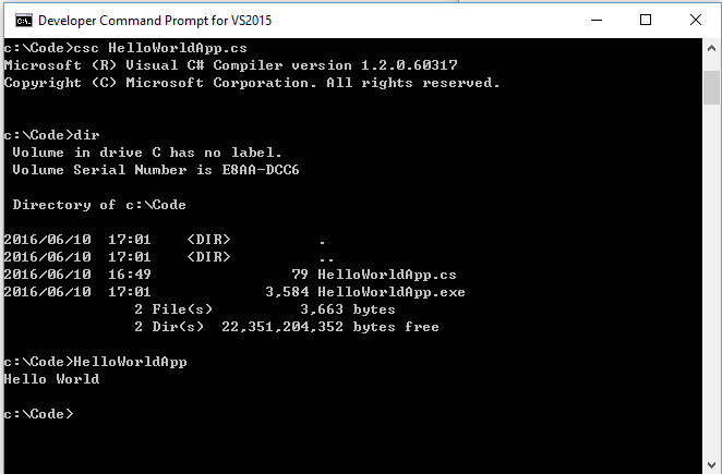 进入 C:Code 文件夹 cd C:Code使用 C# 编译器编译源代码 csc HelloWorldApp.cs查看文件目录结构 dir输入EXE 名来运行应用程序 HelloWorldApp