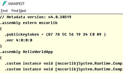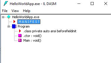 在 Developer Command Prompt 输入 ildasm HelloWorldApp.exe,你会看到ILDASM 工具加载编译过后的程序集: