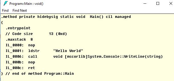 注意IL 指令:ldstr(load string ),nop(no operation ),call,ret(return)。记住IL 最终被 CLR 执行。