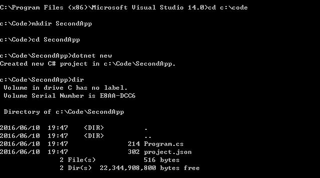 dotnet new 命令创建了一个新的.NET Core 应用程序,包含两个文件,分别是 Program.cs 和 project.json。