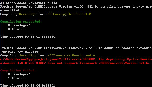 "frameworks": { "netcoreapp1.0": { "imports": "dnxcore50" }, "net46":{}}遗憾的是,dotnet build 之后,发生了异常。如下所示(注:当前版本是.NET Core RC 2),