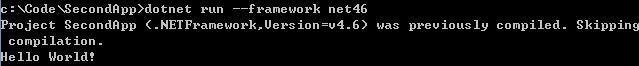 值得注意的是,在 framework 中也可以添加应用程序对其他 frameworks 的支持,添加字符串net46,表示当前的控制台应用程序构建于.NET Framework 4.6之上: