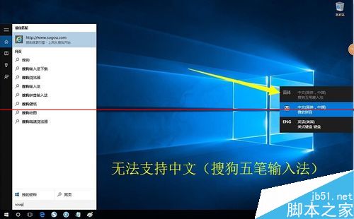 4、之前小编尝试通过“五笔输入法”在Cortana语音搜索框中输入汉字时,出现无法正常显示的问题,其重要原因是“搜狗五笔输入法”与“Win10正式版Cortana”不兼容所造成的,如图所示: