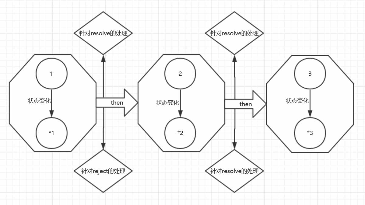 注意:本例中没有传入 针对 reject 的处理,也就是说,上图中不该画出向下的菱形,这里为了方便画出了,只用知道向上向下的菱形跟我们具体如何使用 then 或者 catch 有关。再看一下示例代码: