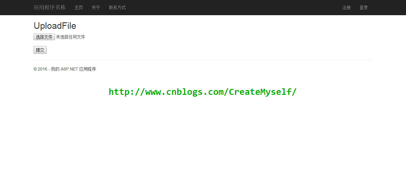 [HttpPost]public ActionResult UploadFile(BlogModel bModel){ if (ModelState.IsValid) {var fileName = bModel.BlogPhoto.FileName;var filePath = Server.MapPath(string.Format("~/{0}", "File"));bModel.BlogPhoto.SaveAs(Path.Combine(filePath, fileName));ModelState.Clear(); }return View();}我们接下来看看效果: