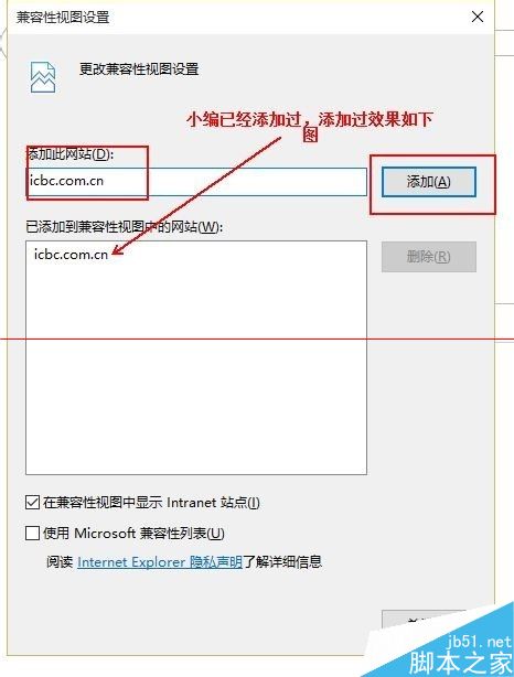 3、将“icbc.com.cn”添加到兼容性视图网站,“关闭”。