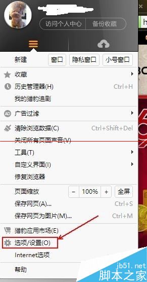 3、打开最新版的猎豹浏览器,选择“选项/设置”按钮。