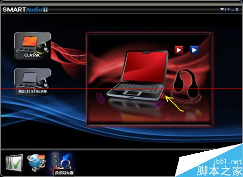 2、接着,打开左下角的 ”音频导向器“,我们会看到电脑外放是有声音的(电脑发出的声波),而耳机是未连接状态,这时只需把耳机插入电脑,然后点击下图右上角的两个按钮,红色或者蓝色的,然后你就能用耳机听到声音了。