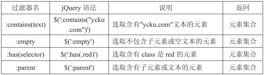 //选择元素文本节点含有 ycku.com 文本的元素$("div:contains("ycku.com")").css("background", "#ccc");$("div:empty").css("background", "#ccc"); //选择空元素$("ul:has(.red)").css("background", "#ccc"); //选择子元素含有 class 是 red 的元素$(":parent").css("background", "#ccc"); //选择非空元素jQuery 提供了一个名称和:parent 相似的方法, 但这个方法并不是选取含有子元素或文本