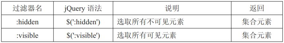 $("p:hidden).size(); //元素 p 隐藏的元素$("p:visible").size(); //元素 p 显示的元素注意::hidden 过滤器一般是包含的内容为:CSS 样式为 display:none、input 表单类型为
