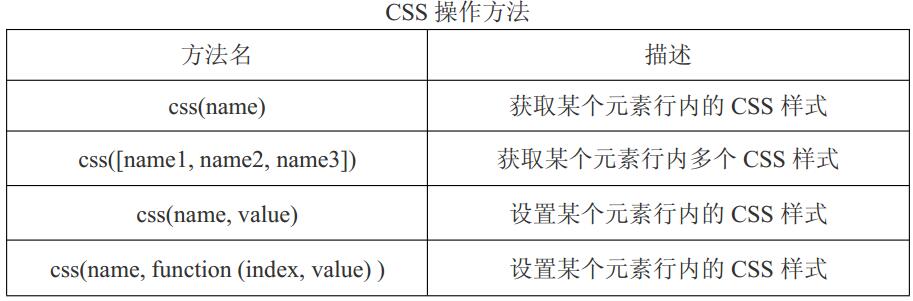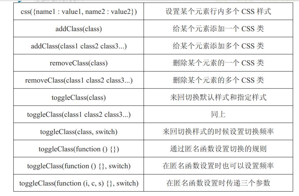 $("div").css({"background-color" : "#ccc","color" : "red","font-size" : "20px"});除了行内 CSS 设置,我们也可以直接给元素添加 CSS 类,可以添加单个或多个,并且$("div").addClass("red"); //添加一个 CSS 类$("div").addClass("red bg"); //添加多个 CSS 类$("div").removeClass("bg"); //删除一个 CSS 类$("div").removeClass("red bg"); //删除多个 CSS 类我们还可以结合事件来实现 CSS 类的样式切换功能。