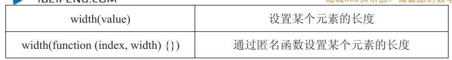$("div").width(); //获取元素的长度,返回的类型为 number$("div").width(500); //设置元素长度,直接传数值,默认加 px$("div").width("500pt"); //同上,设置了 pt 单位$("div").width(function (index, value) { //index 是索引,value 是原本值return value - 500; //无须调整类型,直接计算});