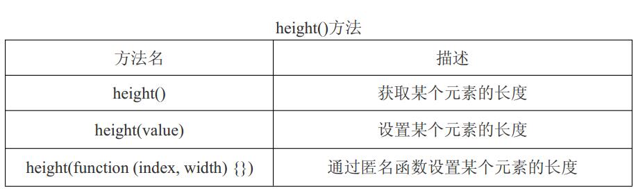 $("div").height(); //获取元素的高度,返回的类型为 number$("div").height(500); //设置元素高度,直接传数值,默认加 px$("div").height("500pt"); //同上,设置了 pt 单位$("div").height(function (index, value) { //index 是索引,value 是原本值return value - 1; //无须调整类型,直接计算});