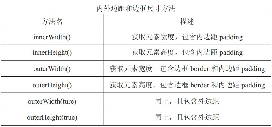 alert($("div").width()); //不包含alert($("div").innerWidth()); //包含内边距 paddingalert($("div").outerWidth()); //包含内边距 padding+边框 borderalert($("div").outerWidth(true)); //包含内边距 padding+边框 border+外边距 margin