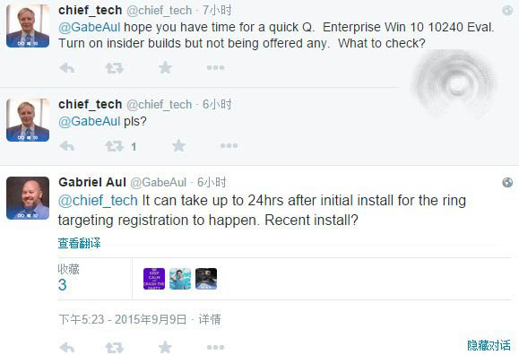 从这位先生提问的方式可以看出,他应该是一位很有修养的绅士,但Aul一个多小时之后才回答他的问题,让他有点心急……他向这位Win10预览体验计划负责人询问在打开Win10企业版10240的预览版接收“开关”之后,却没有收到企业预览版的推送,不知道是什么原因,需要检查什么位置?Aul回答道:“(在开启Win10预览版接收后)需要等待最多24小时来完成预览版接收注册内容的内部安装。”