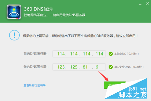在“360 DNS优选”界面中,将自动给出最佳“首选DNS”和“备用DNS”,在此直接点击“立即启用”按钮。