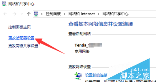 待进入“网络和共享中心”界面后,点击左上角的“更改适配器”按钮。如图所示:
