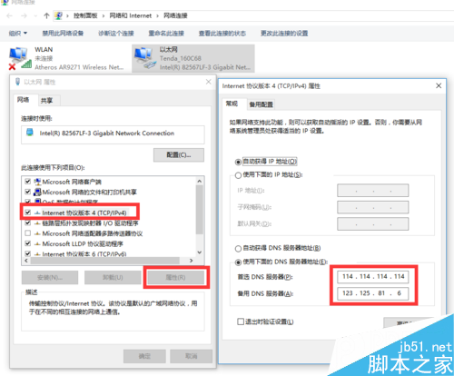 从打开的“本地连接 属性”窗口中,选中“Internet协议(TCP/IP V4)”,点击“属性”按钮,并在弹出的“属性”窗口中手动设置DNS地址,点击“确定”完成设置。