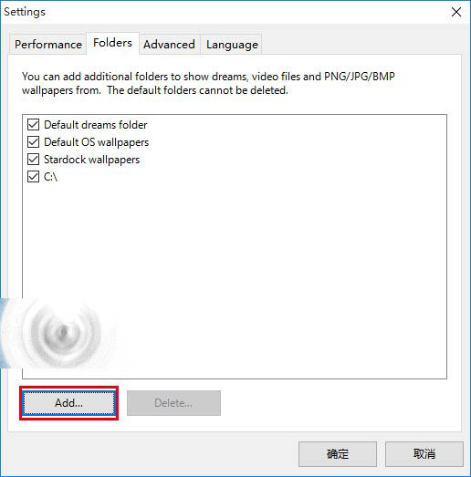 这款软件可以使用专用的动态壁纸,比如“英雄”主题,你可以在文末下载链接处下载该动态壁纸。成功下载后,你要首先告诉软件动态壁纸文件位置,在软件右上角点击齿轮图标,在弹出的“设置”窗口中选择Folders选项卡,点击“Add”按钮添加刚刚下载的动态壁纸所在位置(如上图)。然后就可以在软件左侧壁纸列表最后看到自己加入的动态壁纸。