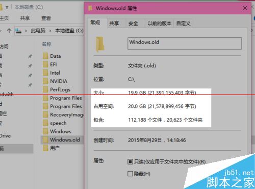 2、我们在 Windows.old 文件夹上右键-->属性,会弹出文件夹属性对话框并计算文件夹所占磁盘空间的大小。看看,的确不小吧,20G。