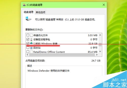 7、然后弹出“C 盘的磁盘清理”窗口,我们在“要删除的文件”列表中滚动、选中“以前的 Windows 安装”,点击“确定”。