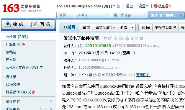 protected void btn_SendEmail_Click(object sender, EventArgs e) { //声明一个Mail对象 MailMessage mymail = new MailMessage(); //发件人地址 //如是自己,在此输入自己的邮箱 mymail.From = new MailAddress("15510180880@163.com"); //收件人地址 mymail.To.Add(new MailAddress(tb_Email.Text)); //邮件主题 mymail.Subject = tb_Subject.Text; //邮件标题编码 mymail.SubjectEncoding = System.Text.Encoding.UTF8; //发送邮件的内容 mymail.Body = tb_Body.Text; //邮件内容编码 mymail.BodyEncoding = System.Text.Encoding.UTF8; //添加附件 Attachment myfiles = new Attachment(tb_Attachment.PostedFile.FileName); mymail.Attachments.Add(myfiles); //抄送到其他邮箱 mymail.CC.Add(new MailAddress(tb_cc.Text)); //是否是HTML邮件 mymail.IsBodyHtml = true; //邮件优先级 mymail.Priority = MailPriority.High; //创建一个邮件服务器类 SmtpClient myclient = new SmtpClient(); myclient.Host = "SMTP.163.com";//SMTP服务端口 myclient.Port = 25; //验证登录 myclient.Credentials = new NetworkCredential("@@@@@@", "*****");//"@"输入有效的邮件名, "*"输入有效的密码 myclient.Send(mymail); }3、效果如下