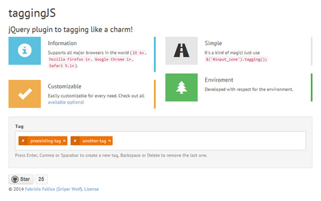 TaggingJS 是一个用来创建高度可定制的前端标签系统的jQuery插件。它小于3 kb并且支持世界上大部分浏览器。它基于MIT 许可。